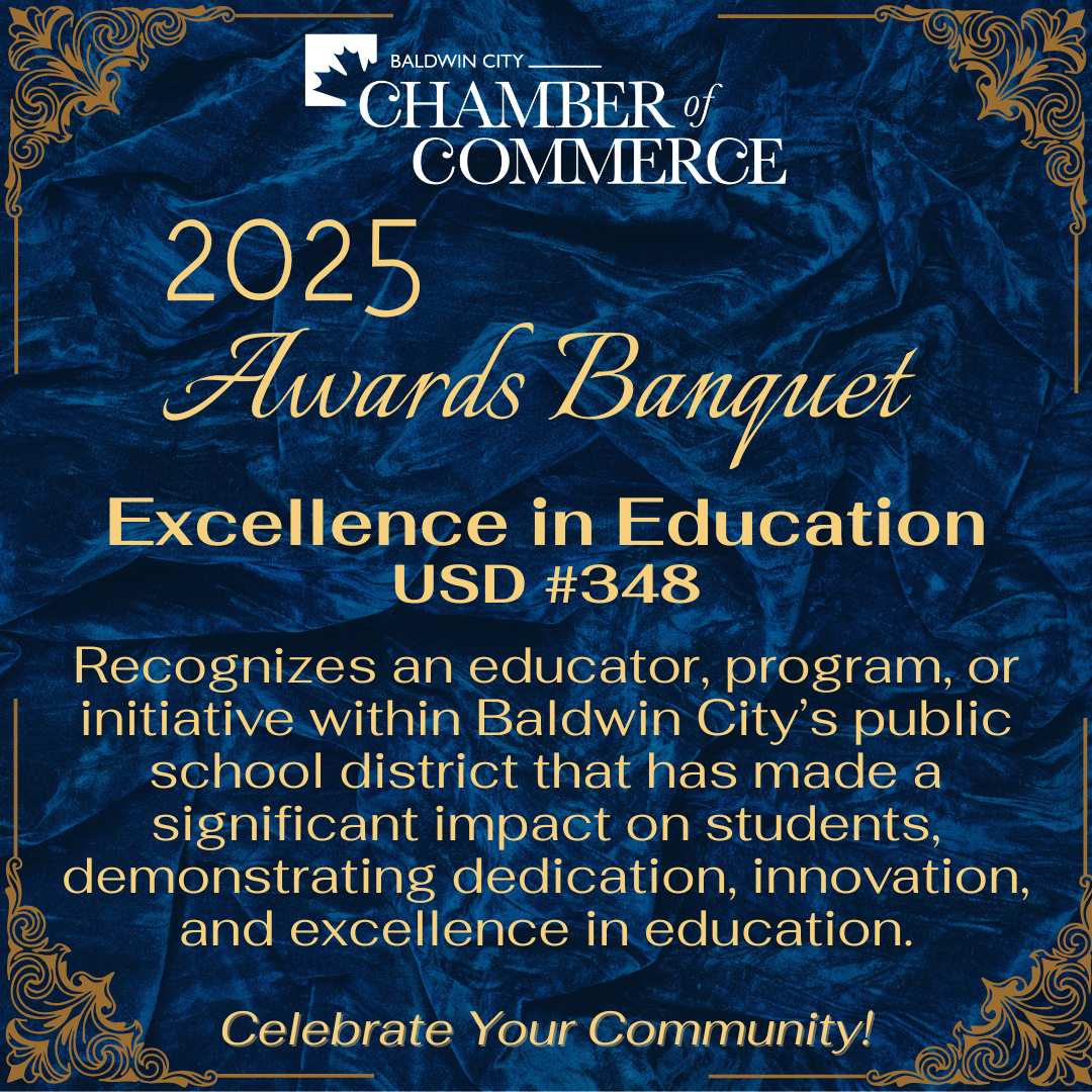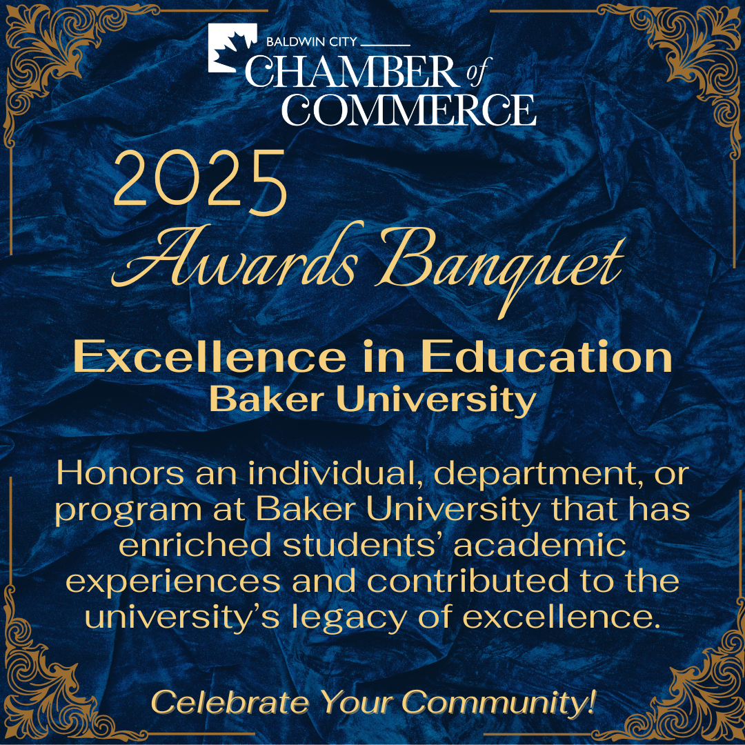 The Baldwin City Chamber of Commerce is excited to host our Annual Chamber Awards Banquet! This signature event celebrates the accomplishments, milestones, and people who make Baldwin City special. The evening will include a silent auction, 50/50 raffle, and the presentation of eight business and community awards. The event highlights the Best of Baldwin City and has sold out the last several years.