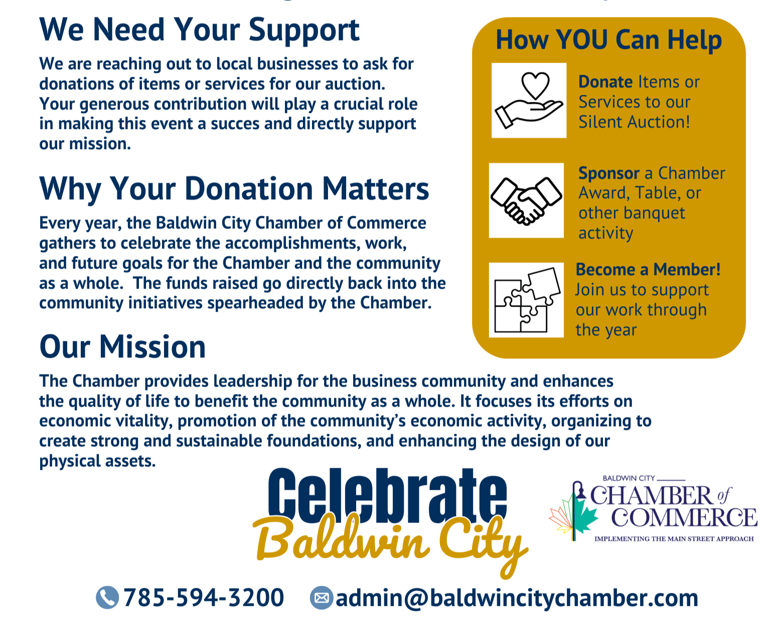We are currently seeking donations for our Silent Auction and invite you to participate as a way to showcase your business while supporting the Chamber’s mission.